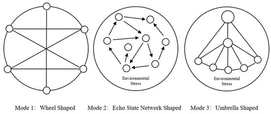 Three modes facilitating medium–high intensity collaborative governance relationships. Note: “○” represents the actors participating in the coastal zone environmental governance; “─” represents the establishment of a medium–high intensity collaborative governance relationship among actors; and “→” represents the initialization stage of the establishment of medium–high intensity collaborative governance relationship, where the direction of the arrow represents the direction of the randomly generated connection relationship.