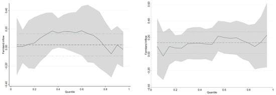 Figure 1 also shows that under the constraints of social security, different farmland transfer scales positively affect farmers’ fixed asset investment, offering a curve of rising volatility. The result shows that under the constraints of social security, the transfer of arable land among different quantiles will lead to the expansion of farmer’s fixed investment, and the larger the scale of the inflow, the higher the amount of farmers’ fixed investment. The possible reason is that modern agricultural development in farmers with fixed agricultural investments is relatively high. The allocation of rural factors is somewhat sufficient and reasonable, and increased farm productivity and return rates can be achieved. Generally, they have solid agricultural production willingness, and families result from satisfying income from farm production and hope to increase wealth through farmland inflow. As the expansion of fixed investment is one of the necessary conditions for large-scale agricultural production, these farmers will expand fixed investment after farmland inflow. Therefore, the regression coefficient is generally positive and fluctuates slightly.