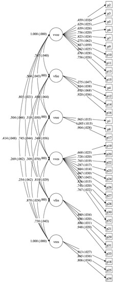 The model of the scale of six oblique factors with the 34 items, adapted to Spanish, was tested [35], obtaining CFA fit index values of χ2 = 1365.30 (df = 512; p < 0.001), χ2/df = 2.67, CFI = 0.963, TLI = 0.959 and RMSEA = 0.041 (90% CI = 0.039–0.044). The factorial loads oscillated between 0.294 for item 9 and 0.955 for item 8. As a function of the goodness-of-fit results, the data of the model were considered adequate. The factor loads of the items and of the standardized factors can be consulted in Figure 1.