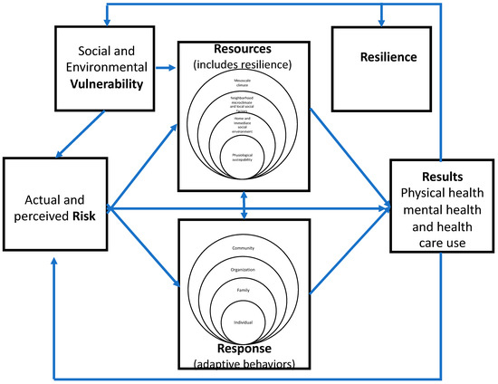 To prevent the occurrence of these adverse impacts, increased attention has been devoted to reducing social and environmental vulnerability [3,26,27] and to building, supporting, and sustaining individual and community resilience [28,29,30]. Resilience is the ability of an individual or community to resist, absorb, accommodate, adapt to, transform, and recover from the effects of persistent stress or a disruptive event in a timely and efficient manner [31,32]. Resilience is also related to the concept of adaptive capacity, defined as “the ability of systems, institutions, humans and other organisms to adjust to potential damage, to take advantage of opportunities, or to respond to consequences” ([33], p. 542). Adaptive capacity is often linked to vulnerability; however, determining the natures of the relationships involving these two constructs is complicated by differences in how they are defined in the literature and how they are linked together [34]. For instance, in a risk-hazard approach, vulnerability is determined by adaptive capacity, whereas in a contextual approach, vulnerability determines adaptive capacity [35,36]. Interpreting vulnerability as an outcome leads to a focus on mitigation of greenhouse gas emissions, technical adaptations, and compensation for climate change. In contrast, interpreting vulnerability as contextual results in a focus on addressing existing social and economic marginalization and inequities and adopts social adaptation and sustainable development as the solution [35].