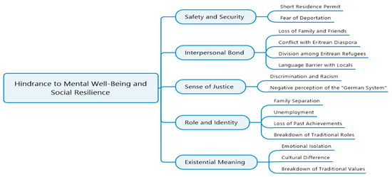 Generally, little attention is given to refugees’ resettlement challenges in the broad context of the social environment. Hence, the current study used a qualitative design to provide multidimensional information about refugee resettlement experiences; it explores the mental wellbeing and social resilience mechanisms of Eritrean refugees living in Germany. This study aimed to understand the Eritrean refugee’s perceptions of their mental wellbeing, identify the social factors and conditions in Germany that may be associated with mental wellbeing and social resilience, and determine the measures taken by Eritrean refugees to adapt to the social challenges faced in the host country and examine the sources and hindrances for Eritrean refugees’ development of social resilience.