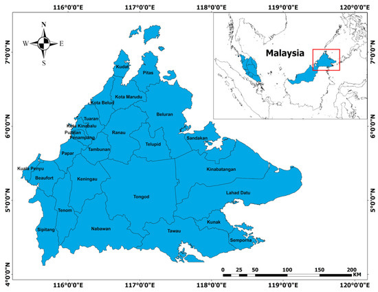 Sabah is the second largest state in Malaysia with an area of 73,619 km2. The state of Sabah consists of five divisions, known as Sandakan (covering 28,205 km2), Tawau (14,905 km2), Interior (18,298 km2), West Coast (7588 km2), and Kudat (4623 km2). Each division contains a combination of several districts. For example, the Sandakan division has five districts, such as Kinabatangan, Beluran, Telupid, Sandakan and Tongod. Meanwhile, Lahad Datu, Tawau, Kalabakan, Kunak, and Semporna are located in the Tawau Division. The West Coast consists of Kota Belud, Kota Kinabalu, Penampang, Putatan, Papar, Ranau and Tuaran. Meanwhile, the Kudat division has the three districts Kota Marudu, Kudat, and Pitas. Both the West Coast and Kudat divisions have the highest and lowest number of districts, respectively. The Interior Division, on the other hand, has six districts, namely, Keningau, Tambunan, Beaufort, Kuala Penyu, Nabawan, Sipitang, and Tenom. In total, there are 27 districts in the state of Sabah, Malaysia, as indicated in Figure 1.