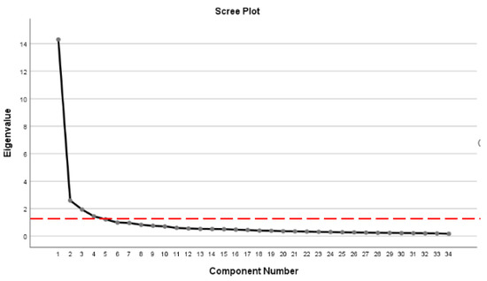 The raw data of this study were analyzed descriptively (frequency, percentage and mean) and inferentially (Principal Component Analysis, K-Means Clustering and Spatial analysis) using the IBM SPSS (Statistical Package for Social Science) version 26. The Principal Component Analysis (PCA) application in this study aimed to simplify the construct B data. The PCA analyzes a data table based on the data observation, which can be described by several inter-correlated quantitative dependent variables. The PCA also assists this study in identifying and extracting any essential information from the statistical data and represent it as a set of new orthogonal variables called principal components [45]. The PCA analysis was carried out twice, since the value of the loading factor (commonality) of the B24 variable, which refers to the inability to focus on virtual learning due to disturbances in the home environment, when carried out the first time was less than 0.5. Hence, before starting the PCA analysis for the second cycle, the B24 variables had to be removed. This is because, according to Kirch et al. [46] and Simanjuntak [47], the eligibility criteria of variables that can be analyzed should begin with a loading factor of 0.5 and above. Barlett’s test result also showed a significant value (x2 = 31466.65, df = 561, p < 0.05), indicating that the sample deserves further analysis. The number of components was identified through the Scree Plot by considering eigenvalues higher than 1 [48]. This means that the total number of components formed is five (Figure 2).