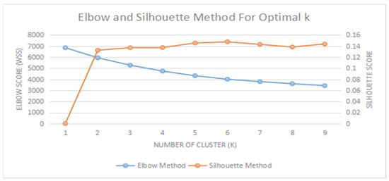 Several approaches or methods can be used to determine the optimal number of clusters (k), such as through the Average Silhouette Method, Elbow Method, and Gap Statistics [52,53,54],. Nevertheless, the optimal number of clusters (k) of this study was determined using the Elbow and Silhouette Methods [53,54]. The elbow and silhouette graphs were produced using machine learning analysis (Jupyter-Anaconda3) and the result demonstrates the optimal number of clusters (k) to be six, as indicated in Figure 3.