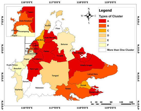 The GIS mapping results show that students in Cluster A are in Semporna, Ranau, Sandakan, Kota Marudu, Tuaran, Kinabatangan, Keningau, Sipitang, and Telupid. Students in Cluster B are in Kota Kinabalu, Putatan, Tawau, and Lahad Datu. Students in Cluster C are in Kunak and Kota Belud, Cluster D are in Kudat and Tongod, and Cluster F are in Beaufort and Penampang. The remaining students in Cluster E are in Papar, Beluran, and Tambunan. There is also a hybrid result showing that there is more than one location representing each of the clusters. In these findings based on Figure 5, there is a small percentage of students in Cluster A and D residing in Kuala Penyu and Pitas; some students in Clusters A, B, and C are located in Tenom; and some students in Clusters B, E and F are located in Nabawan.