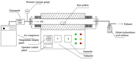 The sintering experiment was accomplished using a tube furnace (Zhonghuan, SK-G08163, Tianjin, China). The raw pellets were put on a corundum dish, and the dish was placed in the center of the tube furnace. An air compressor (Daertuo, XDT550-30L, Zhejiang, China) was used to input air at a flow velocity of 150 mL/min, and the gas flow was controlled by a flow meter (Qixinghuachuang, D07-19B, Beijing, China). The experimental device is shown in Figure 1. The sintering process was controlled by the sintering program of the tube furnace, and the corundum dish was removed after the program was over. After standing at room temperature, sintered ceramsite products were obtained. The exhaust gas generated during the experiment was discharged from the rear of the furnace and passed into the dilute hydrochloric acid solution for scrubbing. In order to further study the influence of different sintering temperatures on the properties of the ceramsite, the experiment was carried out with a raw material ratio of 4.5:4:1.5.