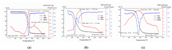 From the TG-DSC curve of the magnesite tailings (Figure 2a), it can be observed that the weightlessness is 47% between 580 °C and 700 °C, and the maximum weight loss rate is 0.59%/min at 680 °C. This is mainly due to the thermal decomposition of MgCO3 [24,25]. The maximum heat flux at 685 °C is also confirmed by the differential scanning calorimeter curve to be 2.35 mW/mg. The weightlessness of SS is about 52% during the whole process, and it can be divided into two stages (Figure 2b). The first stage of weightlessness is about 18%, the start time of weightlessness is 240 min, the end time of weightlessness is 300 min, the maximum weightlessness rate is 6.35%/°C, and the weightlessness time is 297 min. This is because the C-C bond of the organic matter in the SS ruptures during the reaction [26]. The weightlessness is about 28% in the range of 300–500 °C, the maximum weight loss rate is 3.1%/min at 417 °C, and the SS shows a high degree of the exothermic effect. This is due to the oxidizing and decomposing of organic macromolecules and some minerals [27]. It can be seen from the DSC curve that the maximum heat flow rate of 17.7 mW/mg occurs at 490 °C. The decomposition of carbonates, such as CaCO3 and MgCO3, produces a certain weightlessness at 840 °C. At 1000 °C, Fe2O3 reacts with the carbon from the SS pyrolysis to generate CO, and FeS2 oxidizes to generate SO2, resulting in a small amount of weight loss due to gas evolution. The weightlessness of the coal gangue mainly occurs at 470–700 °C (Figure 2c), and the weightlessness rate reaches up to 2.3%/min at 541 °C. This is due to the kaolinite undergoing the dehydration reaction and forming metakaolinite, as well as the combustion of carbon and volatile matter [28]. In addition, the combustion of carbon and volatile matter releases heat. In the temperature range of 1000–1050 °C, there is obvious heat flow fluctuation; this may be due to the transformation of the metakaolinite phase into the amorphous Al-Si spinel phase. Al-Si spinel transforms into mullite crystals at 1050 °C [29,30].