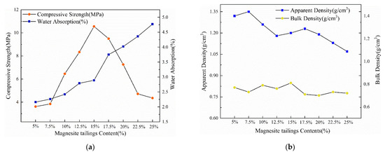 Properties of the ceramsite at different magnesite tailings content (a) compressive strength and water absorption, (b) apparent density and bulk density.