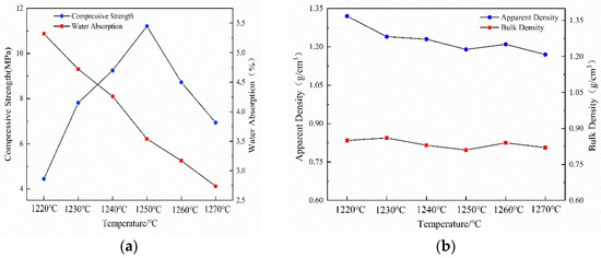 Properties of ceramsites at different temperatures (a) compressive strength and water absorption, and (b) apparent density and bulk density.