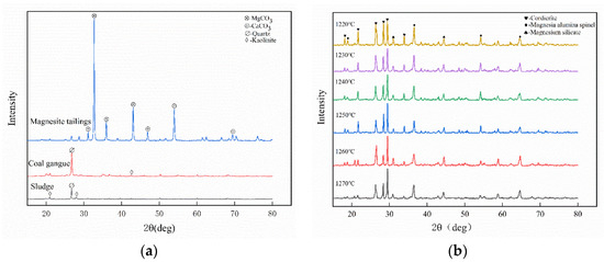 With the rapid development of China’s industry, the disposal of industrial solid waste needs to be solved urgently [1]. China has large reserves and a high mining volume of magnesite, and the proved reserves are about 3.6 billion tons, accounting for 30% of the world reserves, and the annual mining volume reaches 20 million tons. If the tailings generated by mining are not properly treated, they will pollute the environment and endanger human life [2]. Calcination and sintering are currently the most mature tailing disposal methods. The preparation methods of MgCO3 and MgO comprise calcination, hydration, carbonization and thermal decomposition methods, and the preparation method of magnesiaalumina spinel cementitious material is sintering [3]. However, the disadvantages of high energy consumption and incomplete mineral separation are difficult to avoid. In addition, the disposal of SS and CG has also become a difficult problem that cannot be ignored. SS production reached 70 million tons in China in 2020 [4,5], and the annual accumulation of CG also reached 280 million tons [6,7,8]. Incineration is the most mature treatment method of SS, and the treatment of coal gangue is mainly for power generation and road paving. However, the existing methods have the problems of causing secondary pollution and having a low comprehensive utilization rate. Thus, an effective disposal method should be proposed to recycle these solid wastes in an environmentally friendly and sustainable manner [9].