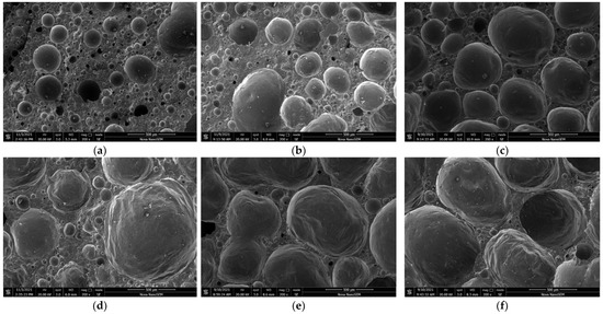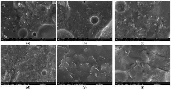 Surface microstructures of ceramsite at different sintering temperatures: (a) 1220 °C, (b) 1230 °C, (c) 1240 °C, (d) 1250 °C, (e) 1260 °C, (f) 1270 °C.
