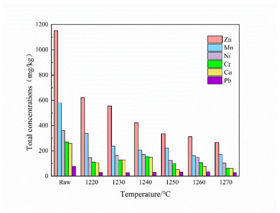 Figure 8 shows the heavy metal concentrations in the ceramsites under different sintering temperatures and before sintering. The contents of Zn, Mn, Cu, Cr, Ni, and Pb in the raw pellets were 1151.52, 579.51, 361.5, 270.48, 258, and 77 mg/kg, respectively. When the sintering temperature was increased from 1220 °C to 1270 °C, the heavy metal concentrations in the ceramsites decreased significantly. The heavy metals Zn, Mn, and Ni, with high contents in the raw materials, were significantly decreased At 1250 °C, the concentrations of Zn, Mn, and Ni in the ceramsites decreased to 336, 222, and 125 mg/kg, respectively.