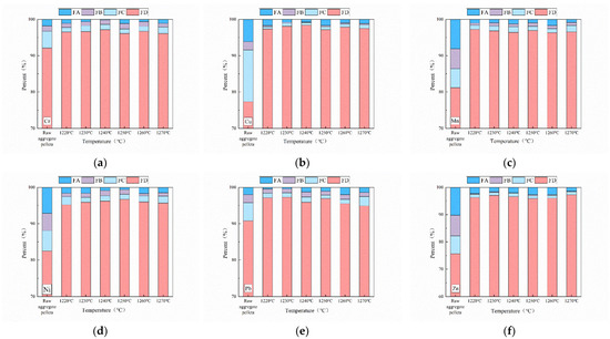 Figure 9 shows that the proportions of Zn, Ni, and Mn in the form of FA were as high as 10.29%, 7.19%, and 8.13%, respectively, when the pellets were not sintered. In addition, the forms of FB also reached 6.9%, 6.3%, and 5.7%. These heavy metal ions exist in chlorides or carbonates under the weak acid state, and they easily break into free particles under natural conditions, and they are considered an environmental risk [42]. The FC of Cu and Cr formed at high proportions of 14.26% and 4.35%, respectively; their potential toxicities can be released under special climatic and geographical conditions, and they are also not be ignored. Pb mainly exists in the form of FD. This is due to it being difficult to release Pb from minerals under natural conditions with less mobility. However, after high-temperature sintering above 1220 °C, all the heavy metals in the ceramsites mainly exist in the form of FD. At a 1250 °C sintering temperature, Zn, Ni, and Mn ions in the form of FA and FB decreased to 0.99%, 0.62%, and 2.68%, and 0.91%, 1.29%, and 0.35%, respectively, and Cu and Cr in the form of FC also greatly reduced. Most heavy metals in FD exist as mineral components. High-temperature sintering promotes the fixation of heavy metals and enhances stability.