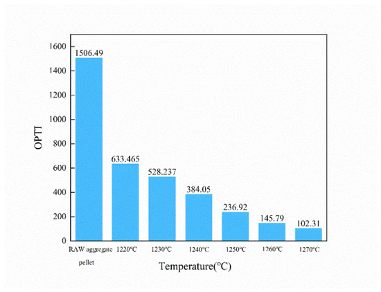 Figure 10 shows the OPTI index of the ceramsites with different sintering temperatures. Before sintering, the OPTI index of the raw pellet was high, even reaching 1506.49, which is harmful to the environment. When the sintering temperature was increased to 1250 °C, the OPTI index of the ceramsites was only 236.92, indicating that the ceramsites are generally safe.