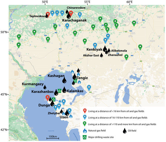 A cross-sectional study using a cluster sample was carried out in Aktobe, Mangistau, and western Kazakhstan provinces (oblasts) of the Republic of Kazakhstan. The study included 850 permanent residents aged 18–60 years. Detailed description of the settlements and recruitment procedures have been presented in our earlier publications [36]. Depending on the distance of residence from oil and gas fields, a comparison was made of the content of toxic elements Al, As, Be, Hg, Cd, and Pb in three groups: less than 16 km, from 16–110 km, and over 110 km. The activities of an oil and gas enterprise affect the human body at a distance of up to 16 km [37], and settlements located more than 110 km away were considered relatively unpolluted [13]. The distance from settlements to deposits was determined using Google Maps. For each settlement, the coordinates of the centers were taken from Wikipedia (Figure 1).
