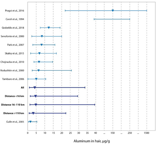 In Figure 2, the distribution of concentrations of Al in the hair of the adult population of western Kazakhstan living in areas of different distances from oil and gas production and processing enterprises is shown, in comparison with similar data on children of the same region [49], and populations of Italy [58], Russia [48], Sweden [56], Poland [57], Canada [52], South Korea [55], and South Sudan [13], as well as the study by Caroli et al., which consolidated the results of several studies [50]. In the presented populations, children from Italy living in the region of industrial pollution and adults of South Sudan should be considered exposed populations, while the rest of the populations are not exposed or include both exposed and unexposed populations (Caroli et al.) [50]. Noteworthy is the lower median Al content in our study (4.08 μg/g) compared with the rest of the populations, with the exception of the study by Gulle et al. (1.63 µg/g). The increase in the level of Al in the hair of the adult population of western Kazakhstan is expressed both in the zone of oil and gas production (0–16 km) and in the more remote zone (16–110 km). Despite the low median of the concentration of Al in the hair of the population of western Kazakhstan, the upper limit of the ranks is significantly higher than in other studies, with the exception of studies by Pragst et al. and Caroli et al. [13,50]. The study by Pragst et al. was conducted in an extremely oil-polluted region of South Sudan [13], and the study by Caroli et al. consolidated a number of studies, including results from both uncontaminated and polluted regions [50].