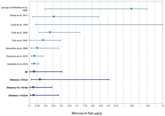 The median distribution of Hg concentration in the hair of the adults of western Kazakhstan does not differ from that previously described in children of the same region [49]. However, it is significantly lower than that of a similar indicator in the populations of Russia [48], Sweden [56], Poland [57], South Korea [55], and Canada [52], and data presented by Iyengar and Woittiez, 1988 [51] (Figure 3). The difference in the level of Hg in the hair of residents between the zones of western Kazakhstan, which differ in distance from oil and gas production enterprises, is very significant. In the zone of oil and gas production (0–16 km), the maximum concentration of Hg in hair in the region of western Kazakhstan was noted (0.338 μg/g), which makes it possible to assume that the change in the concentration of Hg in hair is related to the oil industry.