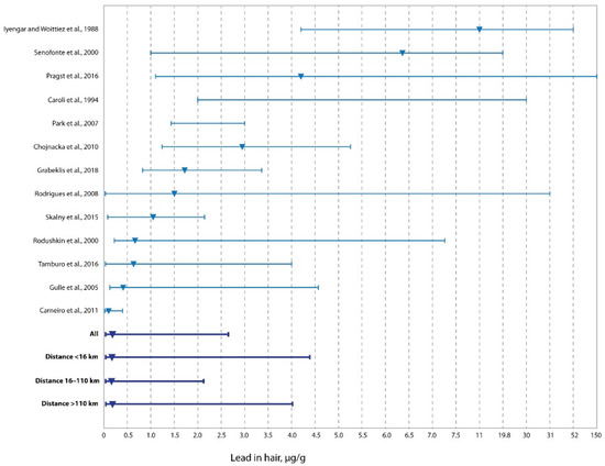 Concentrations of lead in the hair of residents living at different distances from oil and gas production fields vs. literature data (medians and ranges) [13,29,48,49,50,51,52,53,54,55,56,57,58].