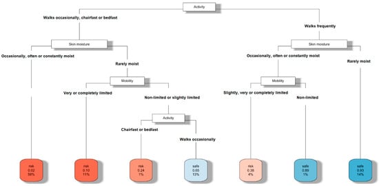 The decision tree that classified those at risk of developing PUs based on the activity and mobility subscales is shown in Figure 1. The algorithm used to perform this output highlighted activity as the first characteristic to take into account. Therefore, according to the degree of activity, one had to see the degree of mobility. For instance, if the patient walked frequently (top-right) and their mobility was very or completely limited, they were at risk of developing PUs, whilst if the patient had nonlimited or slightly limited mobility, the tool informed us to no risk of developing PUs. On the other hand, if the patient did not walk frequently and their mobility was nonlimited or slightly limited, the classification depended on the specific degree of activity. Indeed, if the patient was chairfast or bedfast, they were at risk of developing PUs, whilst if the patient walked occasionally and their mobility was slightly limited, they were also at risk. If their mobility was nonlimited, there was no risk. Finally, as expected, if the patient walked occasionally, they were chairfast or bedfast and their mobility was very or completely limited, there existed a risk of developing PUs.