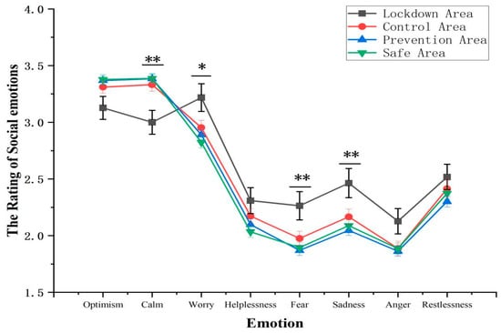 Social emotions in different areas. * p < 0.05, ** p < 0.01.