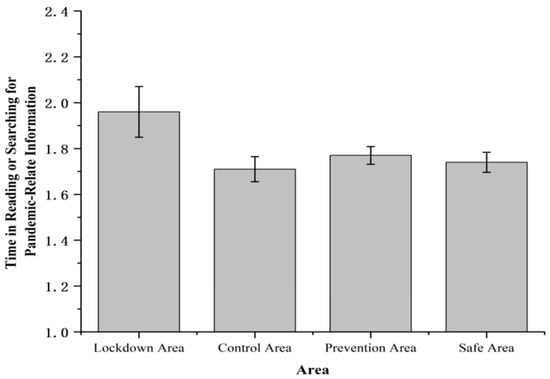 There were no significant differences in the time reading or searching for pandemic-related information among four areas, F (3, 1631) = 1.78, p > 0.1, η2p = 0.003 (Figure 2).