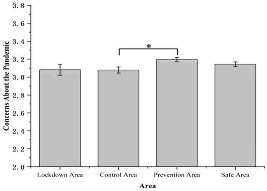 Concerns about the pandemic information were significantly different among four areas, F (3, 1631) = 2.97, p < 0.05, η2p = 0.005 (Figure 3). Participants in the control area (3.08 ± 0.03) reported significantly lower concerns about the pandemic compared with that in the prevention area (3.20 ± 0.03), p < 0.05.