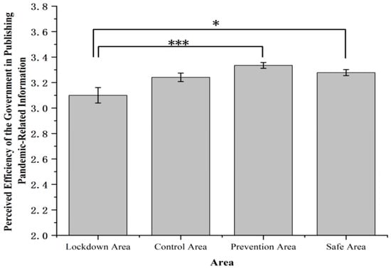 Perceived efficiency of the government in publishing pandemic-related information showed significant differences among four areas, F (3, 1631) = 6.07, p < 0.001, η2p = 0.011 (Figure 4). Participants in the lockdown area (3.10 ± 0.06) reported lower rating of efficiency of the government compared with the prevention area (3.34 ± 0.02, p < 0.001) and the safe area (3.28 ± 0.02, p < 0.05).