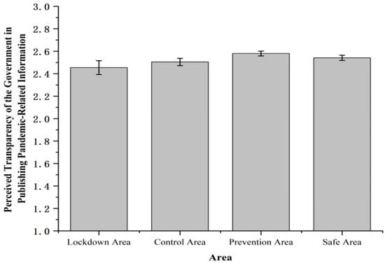Otherwise, we found that the differences of the perceptions of the transparency of public information on the pandemic among four areas were marginally significant, F (3, 1631) = 2.52, p = 0.056, η2p = 0.005 (Figure 5). The rating of the transparency of public information on the pandemic was highest in the prevention area (2.58 ± 0.02), followed by the safe area (2.54 ± 0.02), the control area (2.50 ± 0.03), and the lockdown area (2.45 ± 0.06).