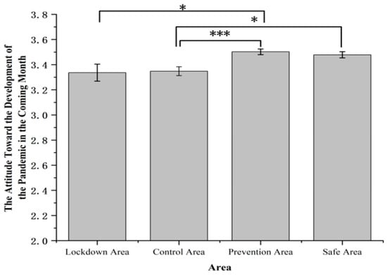 The attitude of the development of the pandemic in the coming month showed significant differences among four areas, F (3, 1631) = 6.52, p < 0.001, η2p = 0.012 (Figure 6). Respondents living in the lockdown area (3.34 ± 0.07) had a significantly more pessimistic view of the development of the pandemic compared with prevention area (3.50 ± 0.02, p < 0.05). Additionally, respondents living in the control area (3.35 ± 0.03) also had a significantly more pessimistic view of the development of the pandemic compared with the prevention area (3.50 ± 0.02, p < 0.001) and the safe area (3.48 ± 0.02, p < 0.05).