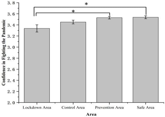 Confidence in fighting the pandemic showed significant differences among four areas, F (3, 1631) = 4.44, p < 0.01, η2p = 0.008 (Figure 7). Participants living in the lockdown area (3.34 ± 0.06) had a significantly more pessimistic view of confidence in fighting the pandemic compared with the prevention area (3.53 ± 0.02, p < 0.05) and the safe area (3.54 ± 0.03, p < 0.05).