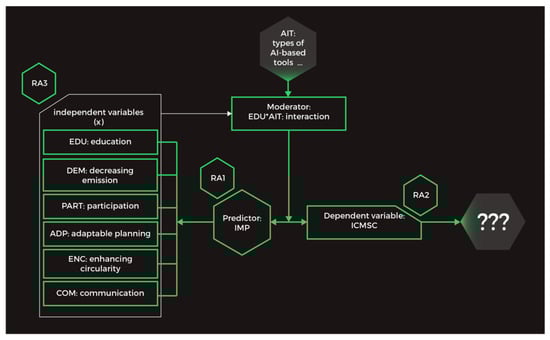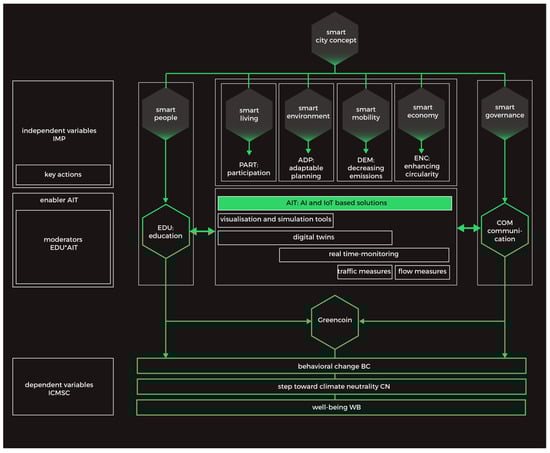 - As the dependent variable, we chose the global impact on climate mitigation in a smart city (ICMSC). The dependent variable (ICMSC) is predicted, and its value depends on changes in the independent variable (IMP). They can be related to behavioral change, a step toward climate neutrality and well-being [64] (assumption RA2).