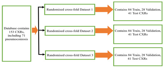 We have made use of the posterior–anterior (PA) CXRs databases that were accumulated by the Coal Services Health NSW, St. Vincent’s Hospital Sydney, Wesley Medical Imaging Queensland, and ILO. The database contained total 153 images, including 71 pneumoconiosis CXRs. To keep the training data balanced, 112 X-rays (56 normal and 56 pneumoconiosis) were used for training and 41 X-rays (26 normal and 15 pneumoconiosis) were used for testing. 25% of the training data was kept as a validation data set in order to select the best model weights based on validation performance. We repeated the randomised selection three times before dividing our total dataset into three folds, namely randomised 3 cross-fold Dataset 1, Dataset 2, and Dataset 3, as shown in Figure 1.