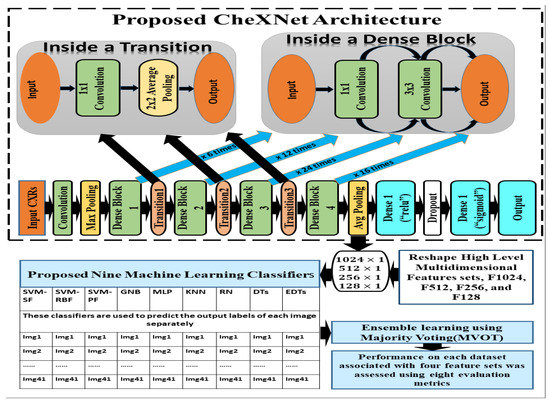 Firstly, we extracted four sets of multidimensional high-level CheXNet-121 features (F1024, F512, F256 and F128) independently from the three randomized cross-fold datasets as discussed in Figure 1. Here, each feature set indicates the number of features extracted from each image. Secondly, extracted features were used as the input of nine classifiers, including SVM-SF (support vector machine with sigmoid function kernel), SVM-RBF (support vector machine with radial basis function kernel), SVM-PF (SVM with polynomial function kernel), Gaussian Naive Bayes (GNB), multi-layer perceptron (MLP), radius neighbours (NB), k-nearest neighbours (KNN), decision trees (DTs), and extra decision tree (EDTs), as clearly mentioned in Figure 2. Thirdly, the optimal prediction label was calculated using the strategies of a majority voting (MVOT) system. Finally, the ensemble learning performances among three randomized cross-fold datasets were computed using eight metrics: TPR (true positive rate or recall or sensitivity), TNR (true negative rate or specificity), precision, FPR (false positive rate), FNR (false negative rate), F1-Score, ACC (accuracy), and MCC (Matthews correlation coefficient). Here, the MCC provides a more accurate statistical measure based on the four confusion matrix values of true positives, false negatives, true negatives, and false positives. Therefore, a model will achieve a higher MCC score if and only if it achieves a good return in the four matrix values.