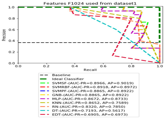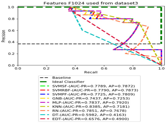 Figure 3, Figure 4, Figure 5 and Figure 6 show the PR curves in an ensemble of nine classifier performances using the corresponding CheXNet-121 feature sets, F1024, F512, F256, and F128 of Dataset 1. The highest AUC-PR and AP values on F1024 were 0.8966 and 0.9019, respectively, achieved by the same SVM-SF classifier. The highest AUC-PR and AP in the RP curves on F512 were 0.9007 and 0.9046, respectively, achieved by the two classifiers, SVM-SF and MLP. The highest AUC-PR and AP pairs obtained by the same RN classifier in the PR curves of F256 and F128, respectively, are (0.9507 and 0.9490) and (0.9302 and 0.9291).