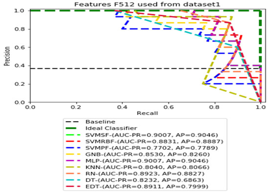 PR curves using feature set F512 as the input of nine classifiers with Dataset 1.