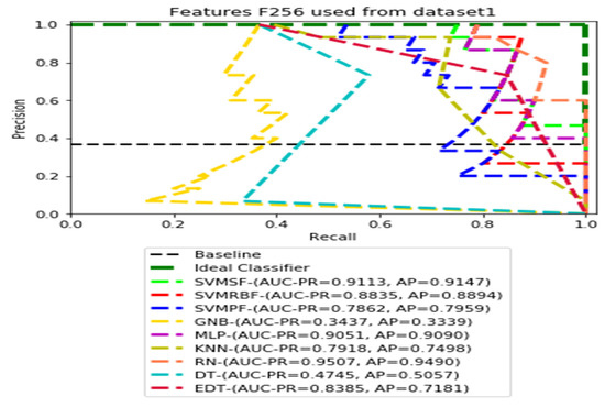 PR curves using feature set F256 as the input of nine classifiers with the Dataset 1.