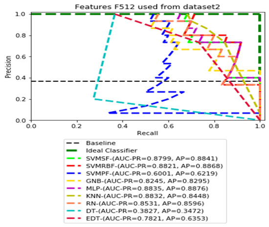 PR curves using feature set F512 as the input of nine classifiers with Dataset 2.
