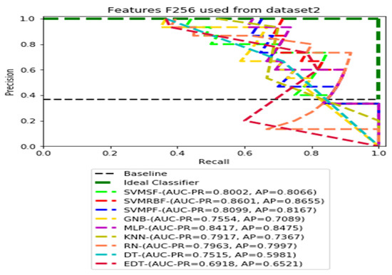 PR curves using feature set F256 as the input of nine classifiers with Dataset 2.