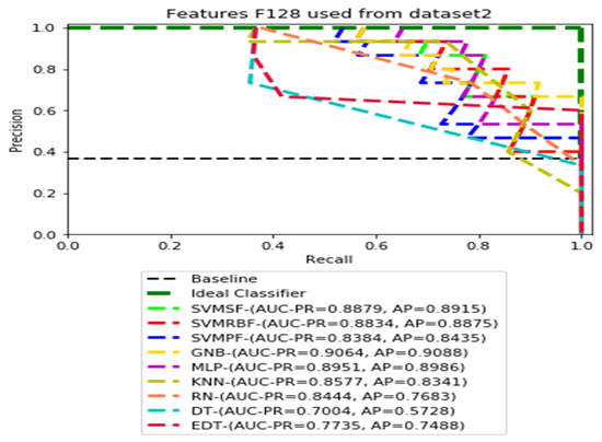 PR curves using feature set F128 as the input of nine classifiers with Dataset 2.