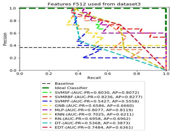 PR curves using feature set F512 as the input of nine classifiers with Dataset 3.