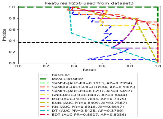 PR curves using feature set F256 as the input of nine classifiers with Dataset 3.