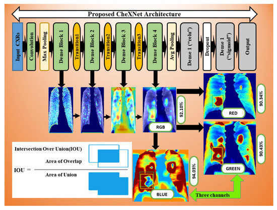 Additionally, we applied the Grad-CAM (gradient-weighted class activation mapping) technique to interpret the most important ROIs that contributed to the classification of pneumoconiosis disease. Finally, we have interpreted the localisation performance of Grad-CAM through four convolutional blocks within the CheXNet-121 architecture, as demonstrated in Figure 2. Next, we split the Grad-CAM image of the high-level feature block into red, green, and blue, as shown in Figure 15. We compared all predicted ROIs with ground truth ROIs based on the measurement of the intersecting area over the union (IOU) between them and best AP values of each classifier and their ensemble. IOU is used to measure the performance of object detection from the overlapping relationship area between the ground-truth and predicted bounding box provided for a particular input image [82,83]. The details proposed Grad-CAM technique of pneumoconiosis detection is presented in Figure 15.