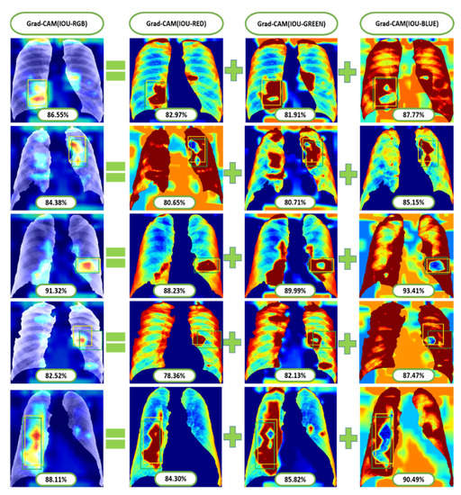 We avoided CAMs before the final block in this study because the deepest convolution layer of each CNN model generates efficient characteristic maps. To demonstrate the efficacy of our technique, we separated three colour channels from the proposed Grad-RGB CAM’s outputs using the CheXNet-121 model and quantitatively compared their visual ROI localisation performance in terms of IOU and AP values. IOU evaluates the accuracy of the Grad-CAM highlighted region of interest (ROI) by splitting and combining the test image’s red, green, and blue channels, as shown in Figure 15.