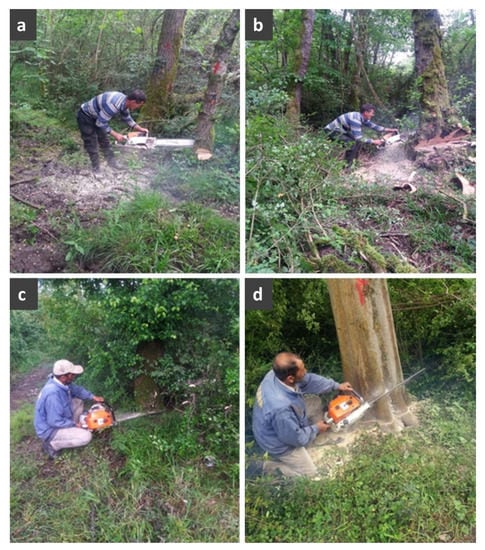 Tree felling includes the following work elements: (a) undercut, which results in an open-faced notch on the tree stem and is very important for the felling direction; (b) backcut, which is made on the opposite side of the notch and practically disrupts the continuity of the wooden tissue with the exception of a hinge that keeps the tree standing; and (c) wedging, which helps break the hinge and initiates the tree’s falling to the ground. Out of a large number of possible working postures during tree felling, we examined the four most common (Figure 1): (a) stoop, during which the back is bent forward with straight legs; (b) flexed stoop, during which the back is bent forward and the legs are also bent; (c) squat, during which the body’s weight is supported by the feet but the knees and hips are bent; and (d) half-kneel, during which the subjects kneel on one knee. The squatting position is differentiated by having a greater than 90° angle bend at the knee joint than with the other postures, where the specific angle ranged from 45 to 60° []. These four postures were described and examined by Grzywiński et al. [], and our inspections of the harvesting sites of the study area justified their selection for the purposes of our study.