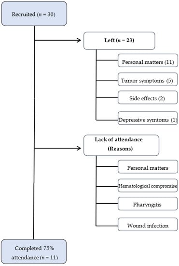 | Left or Not Started Group (n = 11) | Compliance < 75% Group (n = 8) | Intervention Group: Compliance > 75% Group (n = 11) | |
