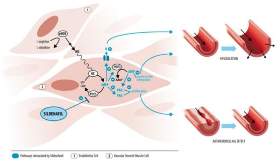 Endothelium-derived NO stimulates the formation of cGMP in vascular smooth muscle cells, which has a double effect: (1) modulation of ion channel activity causing vasodilation, and (2) formation of cGMP-dependent protein kinase (PKG) inhibiting smooth muscle cell proliferation [6]. Inhibition of PDE5 increases intracellular cGMP levels, producing vasodilatory and anti-remodeling effects.