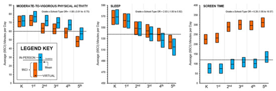 This study evaluated the influence of attending in-person versus virtual school on meeting the 24-h movement guidelines in a sample of children who experienced a hybrid learning scheme during October and November 2020, when pandemic mitigation strategies were common [12]. On days when children attended school in-person, they had higher odds of meeting all three 24-h movement behaviors and higher odds of meeting the physical activity and screen time guidelines individually. It was also found that as the age (grade) increased, the protective effect of attending in-person school on meeting the 24-h movement behaviors increased, even though both the MVPA and sleep duration declined and the screen time trended upward. This study is one of the first to demonstrate the effects of virtual versus in-person school attendance on device-based 24-h movement behaviors in children and one of the first to conduct within-person analyses comparing the movement behaviors between days when children are attending virtual versus in-person school, which further demonstrates the positive impact that structure might have on children’s health behaviors, particularly for older elementary-age children.