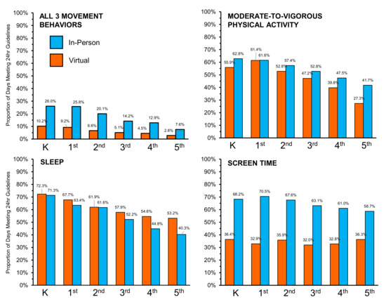 The pandemic mitigation strategy of closing schools, while necessary, may have unintentionally impacted children’s moderate-to-vigorous physical activity (MVPA), sleep, and time spent watching screens. In some locations, schools used hybrid attendance models, with some days during the week requiring in-person and others virtual attendance. This scenario offers an opportunity to evaluate the impact of attending in-person school on meeting the 24-h movement guidelines. Children (N = 690, 50% girls, K–5th) wore wrist-placed accelerometers for 14 days during October/November 2020. Parents completed daily reports on child time spent on screens and time spent on screens for school. The schools’ schedule was learning for 2 days/week in-person and 3 days/week virtually. Using only weekdays (M–F), the 24-h movement behaviors were classified, and the probability of meeting all three was compared between in-person vs. virtual learning and across grades. Data for 4956 weekdays (avg. 7 d/child) were collected. In-person school was associated with a greater proportion (OR = 1.70, 95% CI: 1.33–2.18) of days that children were meeting the 24-h movement guidelines compared to virtual school across all grades. Students were more likely to meet the screen time (OR = 9.14, 95% CI: 7.05–11.83) and MVPA (OR = 1.50, 95% CI: 1.25–1.80) guidelines and less likely to meet the sleep (OR = 0.73, 95% CI: 0.62–0.86) guidelines on the in-person compared to the virtual school days. Structured environments, such as school, have a protective effect on children’s movement behaviors, especially physical activity and screen time.
