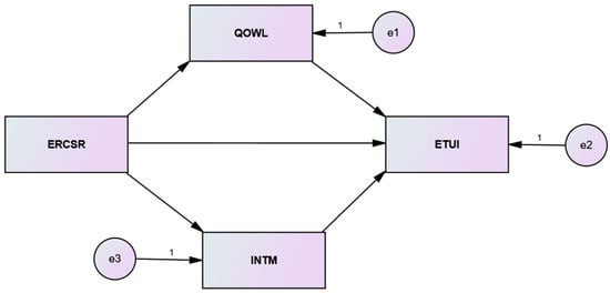 The hypothesized structural model: ERCSR = Ethical leadership (X); QOWL = Quality of work life (M1); INTM = Intrinsic motivation (M2); ETUI = Employee turnover intentions (Y).