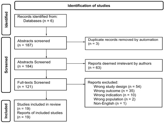 The study selection consisted of three steps. First, each author independently screened all titles and abstracts (n = 187) of relevance for this systematic review [47]. In addition, the reference lists of all the included studies were scanned for relevant papers. Removal of three duplicate publications resulted in selecting 184 published papers. Second, the abstracts of all relevant articles were screened independently for eligibility by each author. Inter-rater reliability was 79%. The 63 articles deemed irrelevant were excluded. Third, the full papers of the included publications were obtained and screened for inclusion and exclusion criteria. The full text of 121 articles was reviewed. Furthermore, 102 articles were excluded, and 19 studies were selected to be analyzed. Figure 1 outlines the search process of the literature [48].
